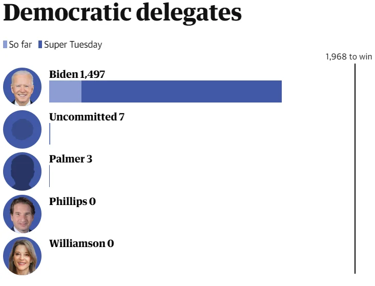 За попередніми підрахунками The New York Times та The Guardian, після Супервівторка та з урахуванням усіх попередніх перемог на праймеріз і кокусах Трамп має голоси вже 995 делегатів від різних штатів — тобто майже 70% від необхідних для номінації від Республіканської партії. У Ніккі Гейлі наразі лише 89 голосів. Натомість Байден наразі має майже 1,5 тис. голосів делегатів з необхідних 1968 для офіційного висунення від Демократичної партії. The Guardian припускає, що чинний президент США може досягти необхідної межі вже за підсумками праймеріз у Флориді, Іллінойсі, Канзасі та Огайо, які пройдуть 19 березня.