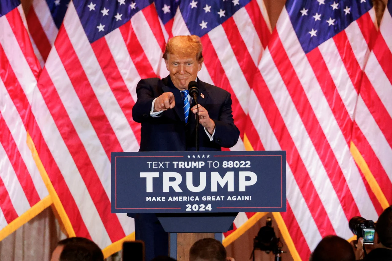 Кандидат у президенти від Республіканської партії та колишній президент США Дональд Трамп жестикулює під час виступу за підсумками Супервівторка у маєтку в Мар-а-Лаго, Палм-Біч, штат Флорида / Фото: REUTERS/Marco Bello