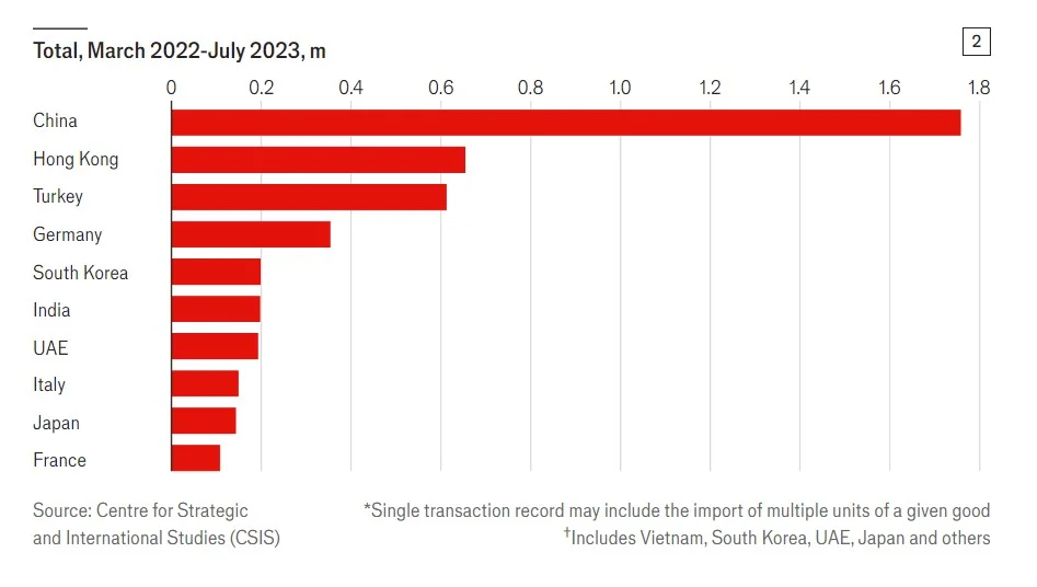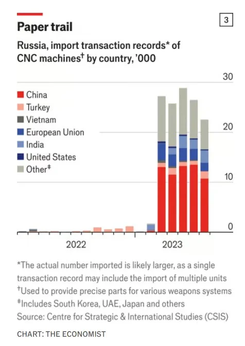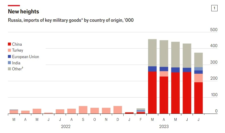 Між березнем і липнем 2023 року між Росією і Китаєм щомісяця фіксувалося понад 10 000 транзакцій, які включали подібне обладнання (і не лише його). А оскільки кожна транзакція може містити кілька товарів, фактична кількість наданих одиниць, ймовірно, була набагато більшою, припускає The Economist.