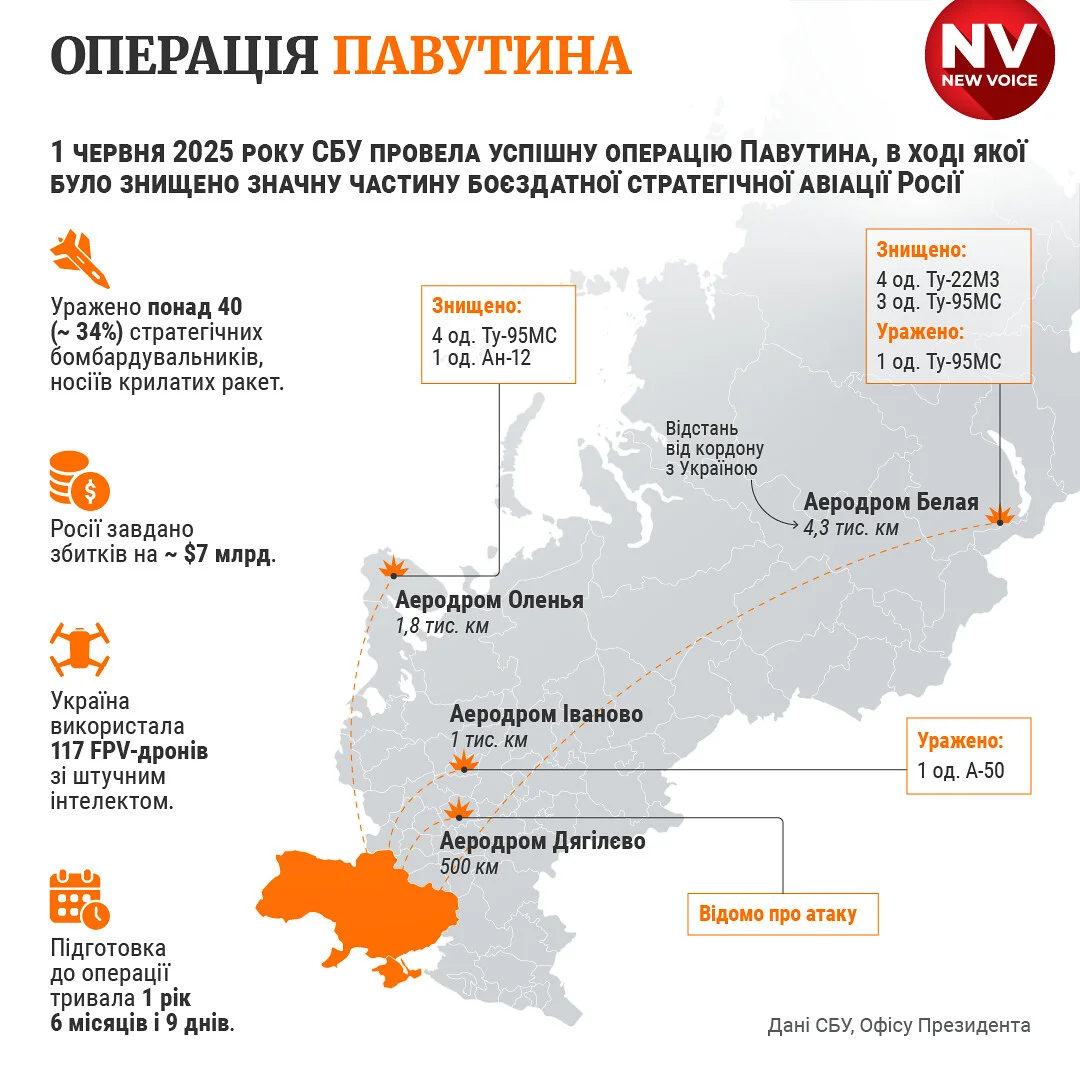 1 червня СБУ провела масштабну операцію зі знищення російських літаків стратегічної авіації. Спочатку повідомлялося, що було уражено понад 40 літаків, які Росія використовувала для атак на українські міста, зокрема А-50, Ту-95 і Ту-22М3.