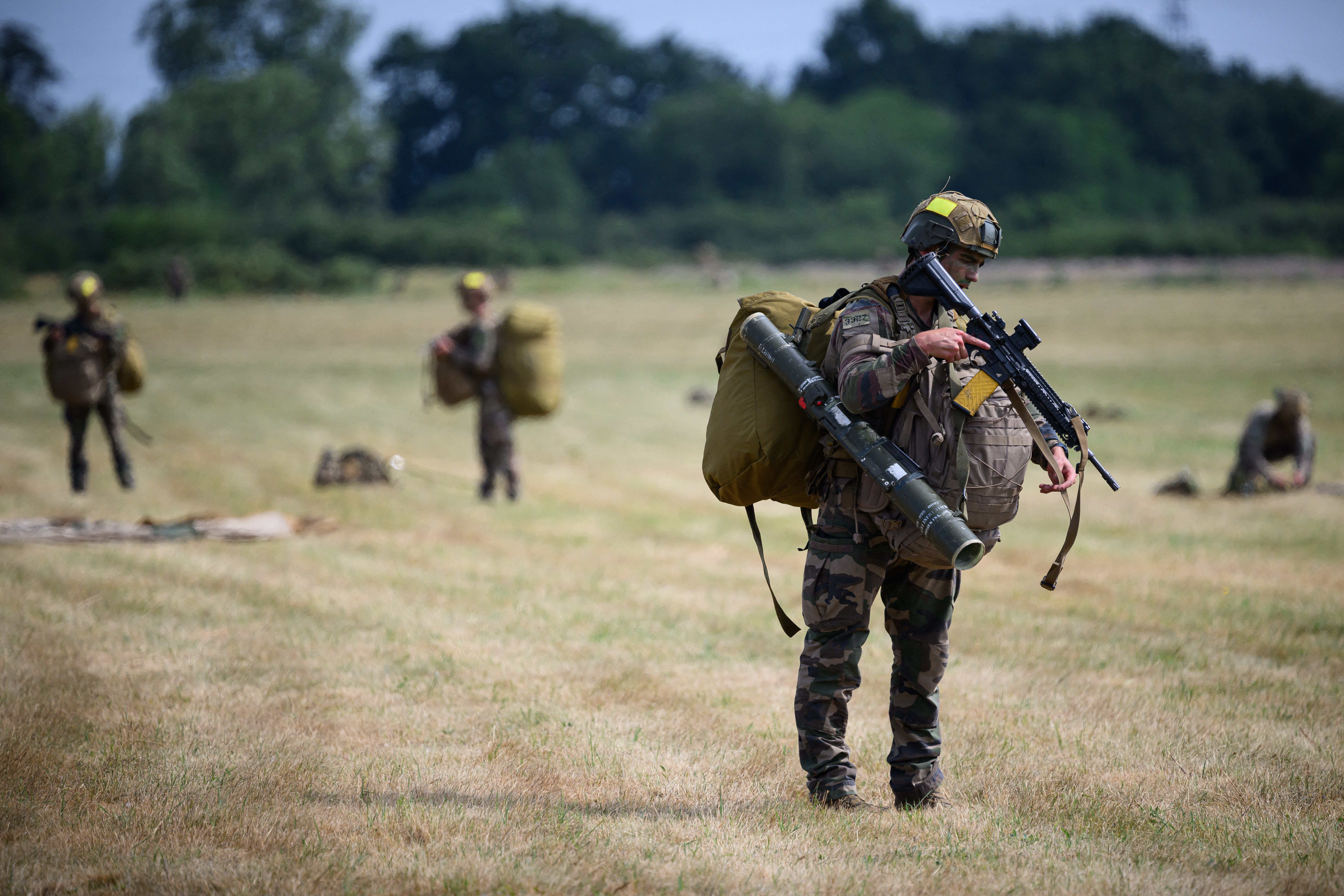 Військові 3-го парашутно-десантного полку морської піхоти після стрибка з парашутом з французького військового літака Airbus A400M під час військових навчань «Cathare 25». Франція, 26 червня 2025 року. Фото Getty Images