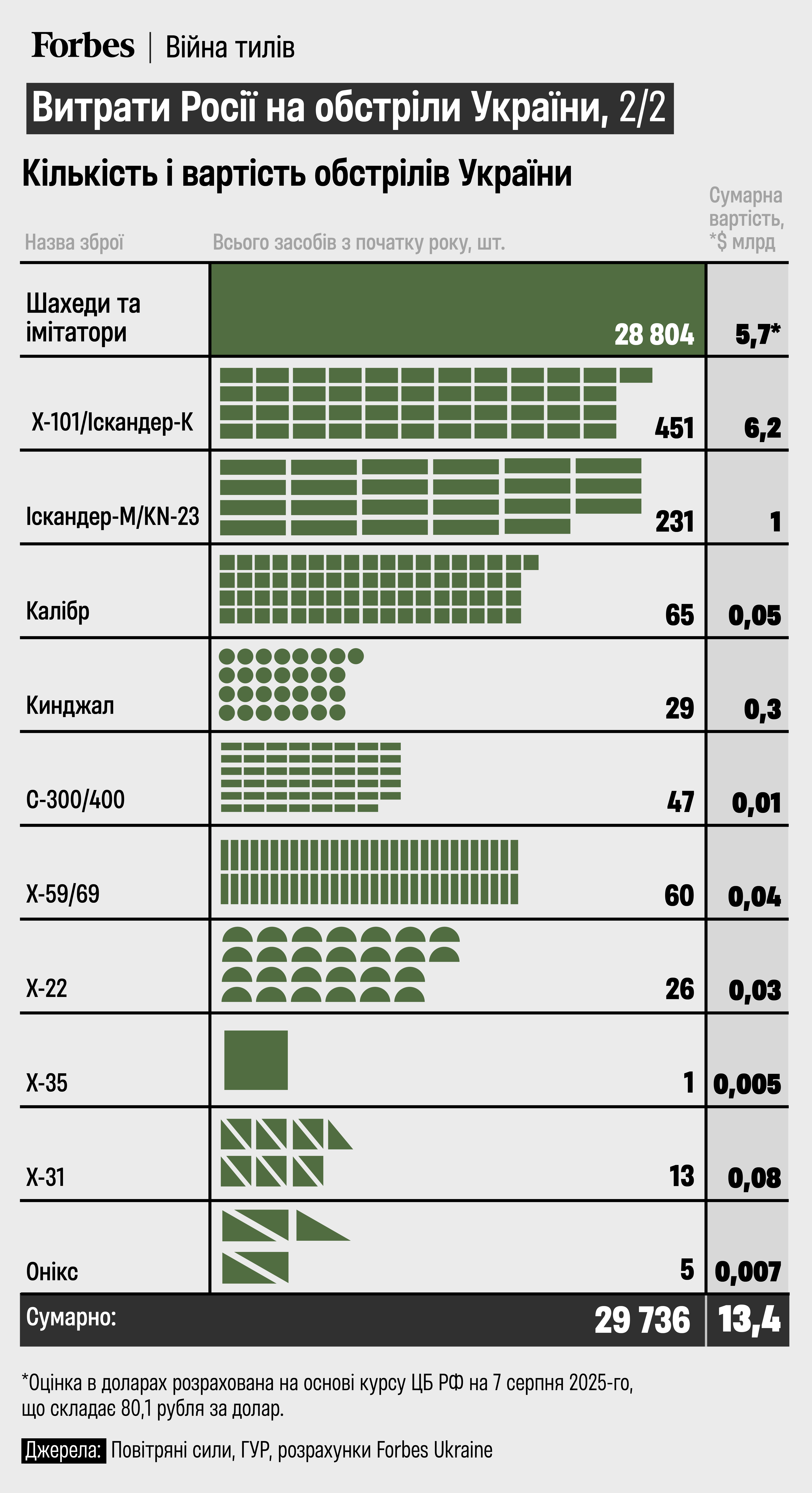 Основним засобом далекобійного терору РФ у 2025 році стали ударні дрони «Shahed-136» та їхні імітатори. За перші сім місяців 2025-го РФ запустила майже 29 000 далекобійних дронів, які несли від 1,4-1,7 млн кг вибухівки, за підрахунками Forbes Ukraine. Ще 932 ракети несли 0,4 млн кг вибухівки.