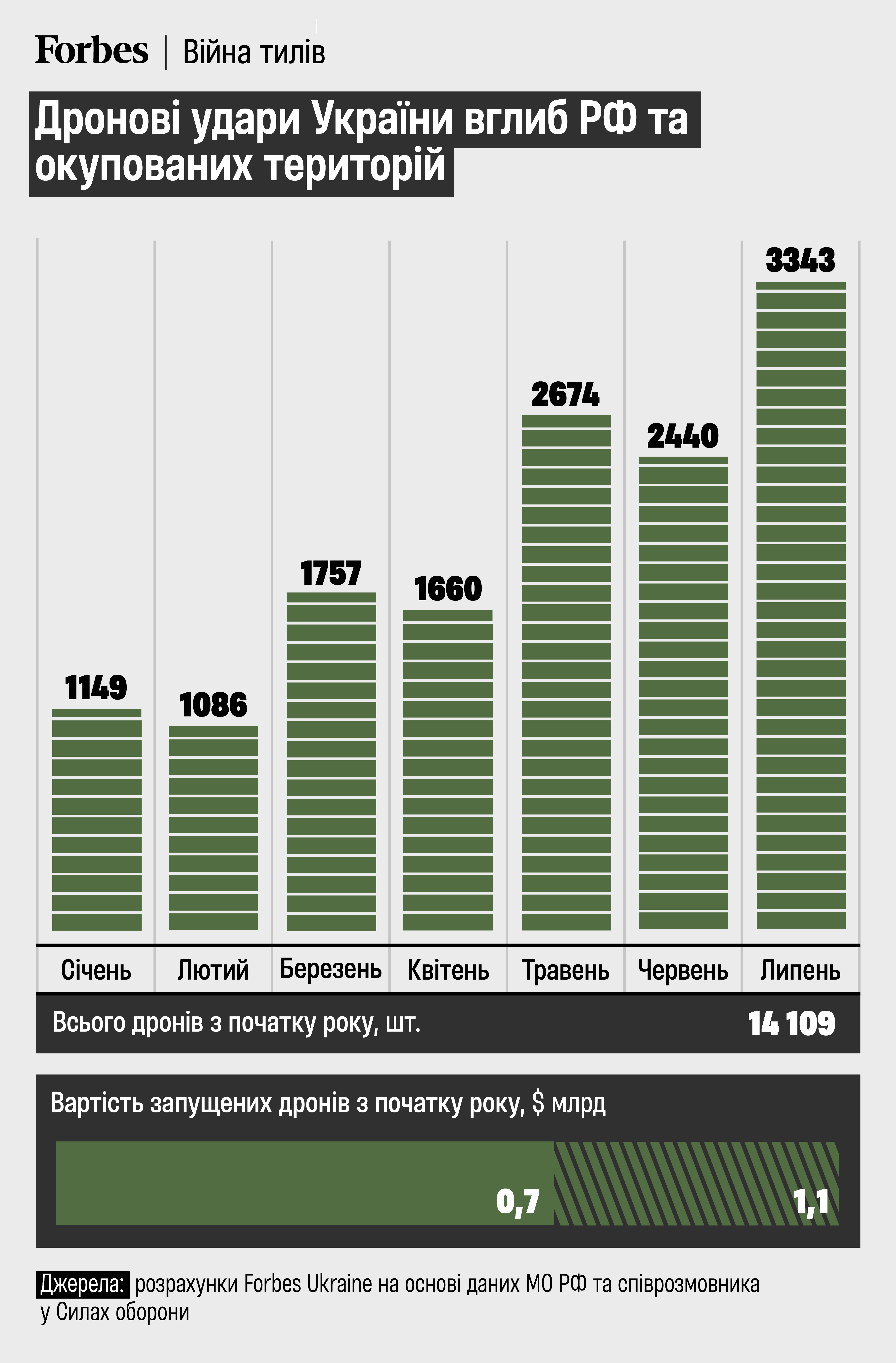Середня вартість українських далекобійних дронів $80 000 – 90 000, оцінює співрозмовник. Не всі дрони є бойовими, частина з них – імітатори та приманки. Оцінка Forbes Ukraine вартості запущених по РФ дронів – від $700 млн до $1,1 млрд.