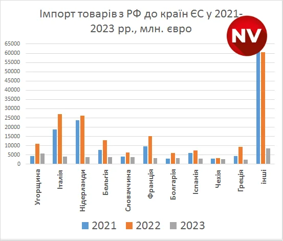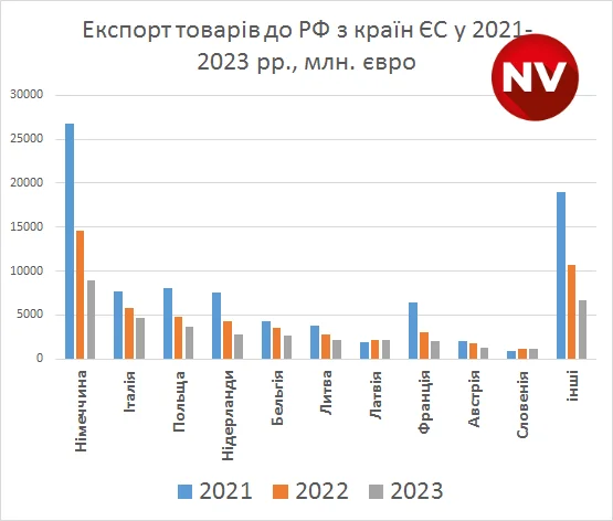 Помітно збільшили поставки на російський ринок Латвія та Словенія. З 1,9 млрд євро до 2,1 млрд євро та з 0,85 млрд євро до 1,1 млрд євро.