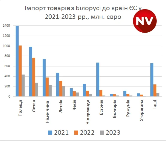 Імпорт з Білоусі до ЄС минулого року склав лише 1,4 млрд євро. Найбільші торгові партнери диктатора Олександра Лукашенка у цьому напрямку — Польща (438 млн євро), Литва (279,5 млн євро), Німеччина (231,5 млн євро) та Латвія (208 млн євро). Вони забезпечують більше 80% білоруського експорту до ЄС. Білоруси переважно постачають до Євросоюзу продукцію АПК, машинобудівного комплексу, хімпрому та товари промислового призначення (деревина, скло, мінвата тощо).