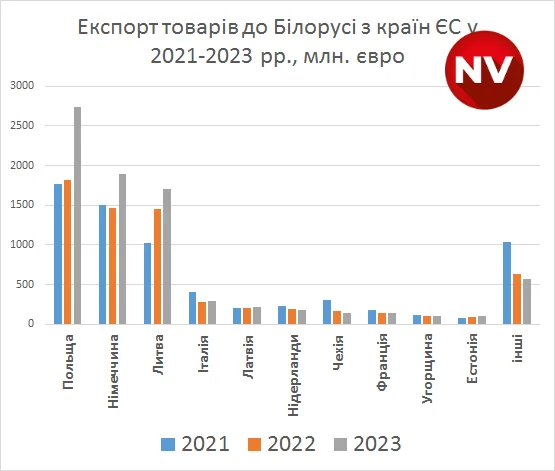 Експорт з ЄС до Білорусі, як ми вже зазначали, за два роки збільшився на 1,3 млрд євро. Найбільше зросли показники Польщі (з 1,8 млрд євро до 2,7 млрд євро) та Литви (з 1 млрд євро до 1,7 млрд євро). Вони займають перше та третє місця серед країн ЄС за експортом до Білорусі. На другом місці Німеччина, яка також збільшила доходи з 1,5 млрд євро (2021 р.) до 1,9 млрд євро (2023 р.).