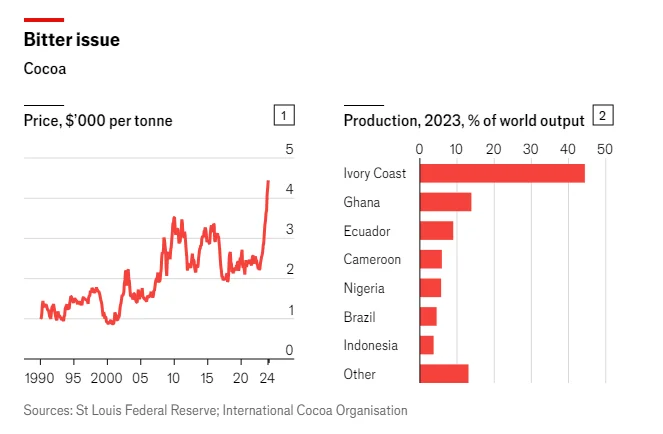 Від початку 2024 року ціна на какао досягла історичного максимуму, піднявшись удвічі з другої половини 2022 року. Поточні оптові ціни на 250% вищі, ніж відпускні ціни на фермах у Гані 2023 року.
