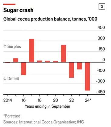 Як пише Economist, 2024 року Ель-Ніньо принесло сильну посуху на ферми какао, що призвело до подальшого скорочення виробництва. За оцінками банку Ing, цього року розрив між світовим виробництвом та споживанням стане найбільшим із 2014 року.