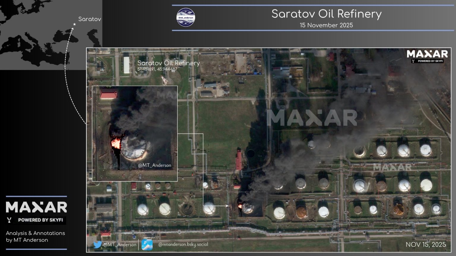 Пожежа на НПЗ у Саратові після удару в ніч на 14 листопада 2025. Джерело: @MT_Anderson