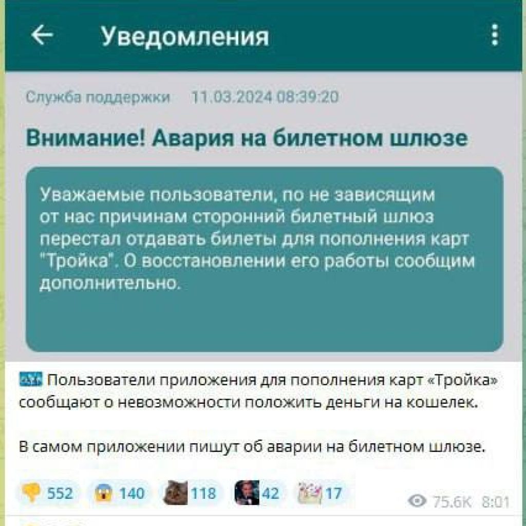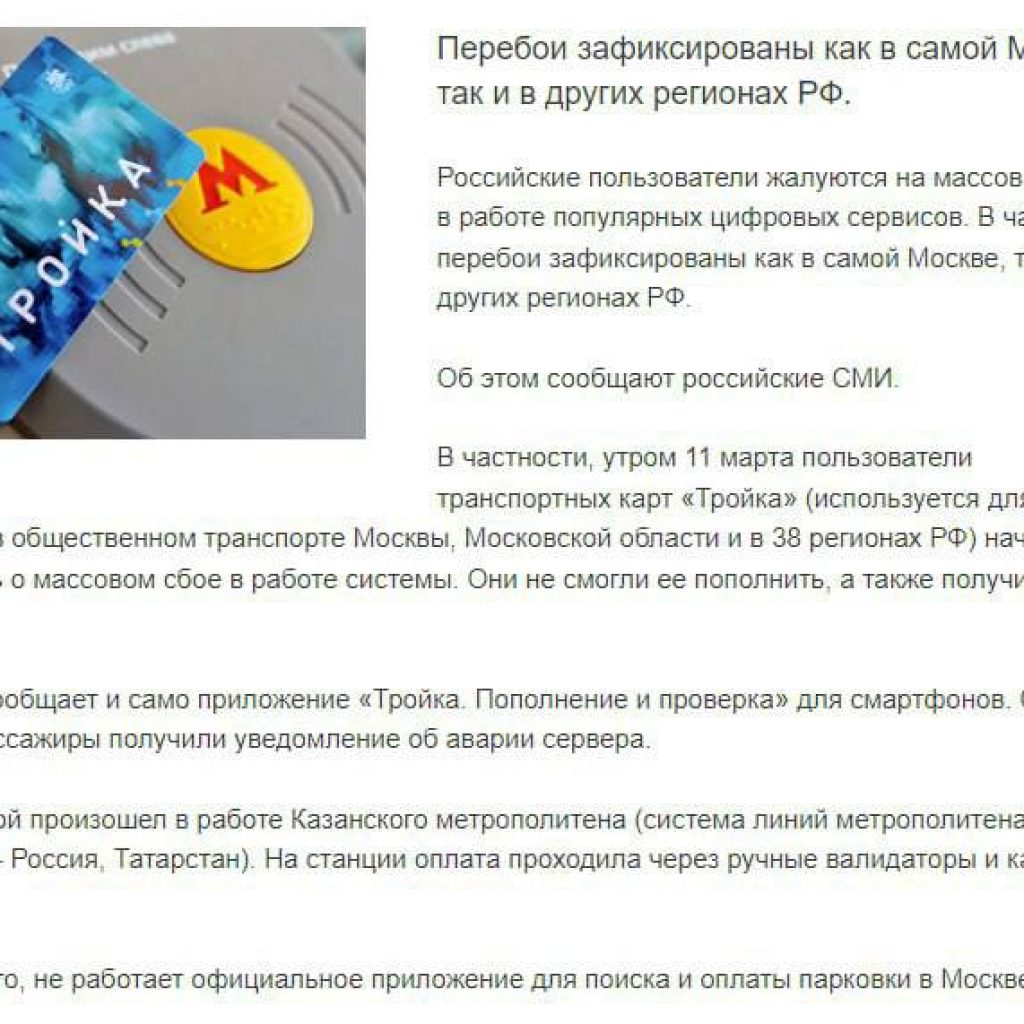 Через цей “збій” власники транспортних карток у Москві та Казані не могли оплатити квитки, поповнити картку проїзду та розрахуватися за паркування.
