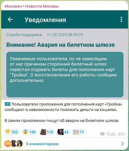 Через цей “збій” власники транспортних карток у Москві та Казані не могли оплатити квитки, поповнити картку проїзду та розрахуватися за паркування.