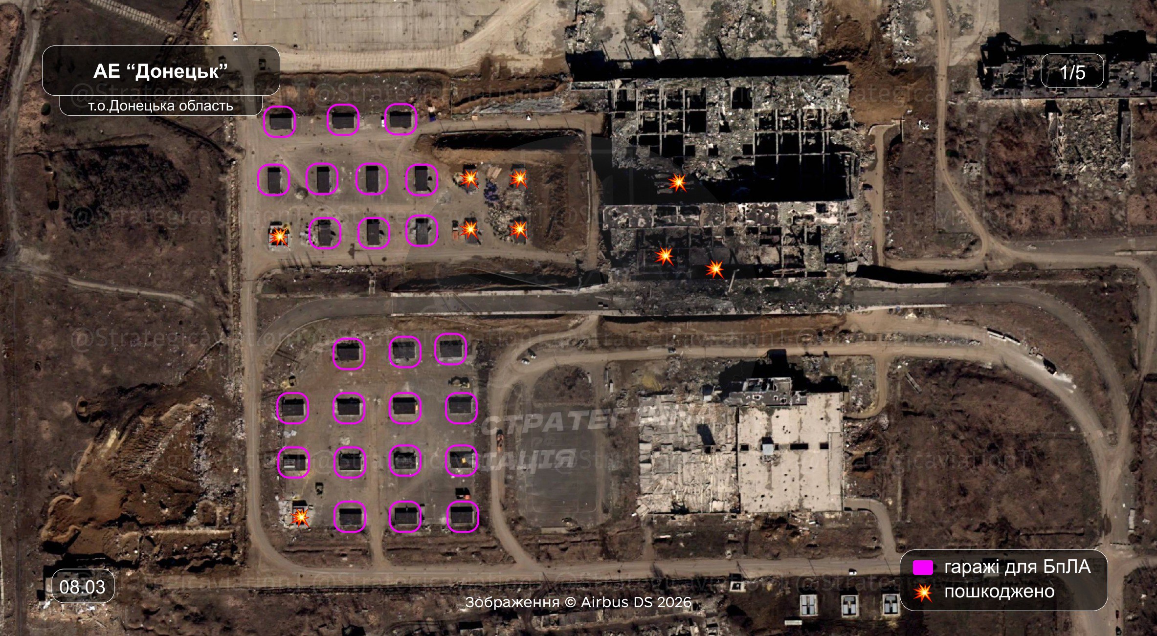 Результатом атаки Сил оборони України на Донецький аеропорт 7 березня стало знищення та пошкодження гаражів, які окупанти використовували для ударних дронів типу Shahed та «Гербера».