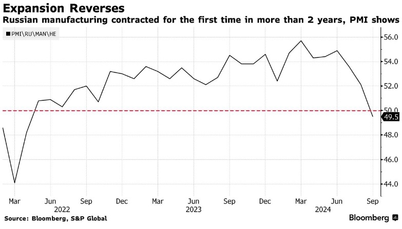 - Російське виробництво у вересні скоротилося вперше з квітня 2022 року, згідно з індексом S&P Global Purchase Managers.