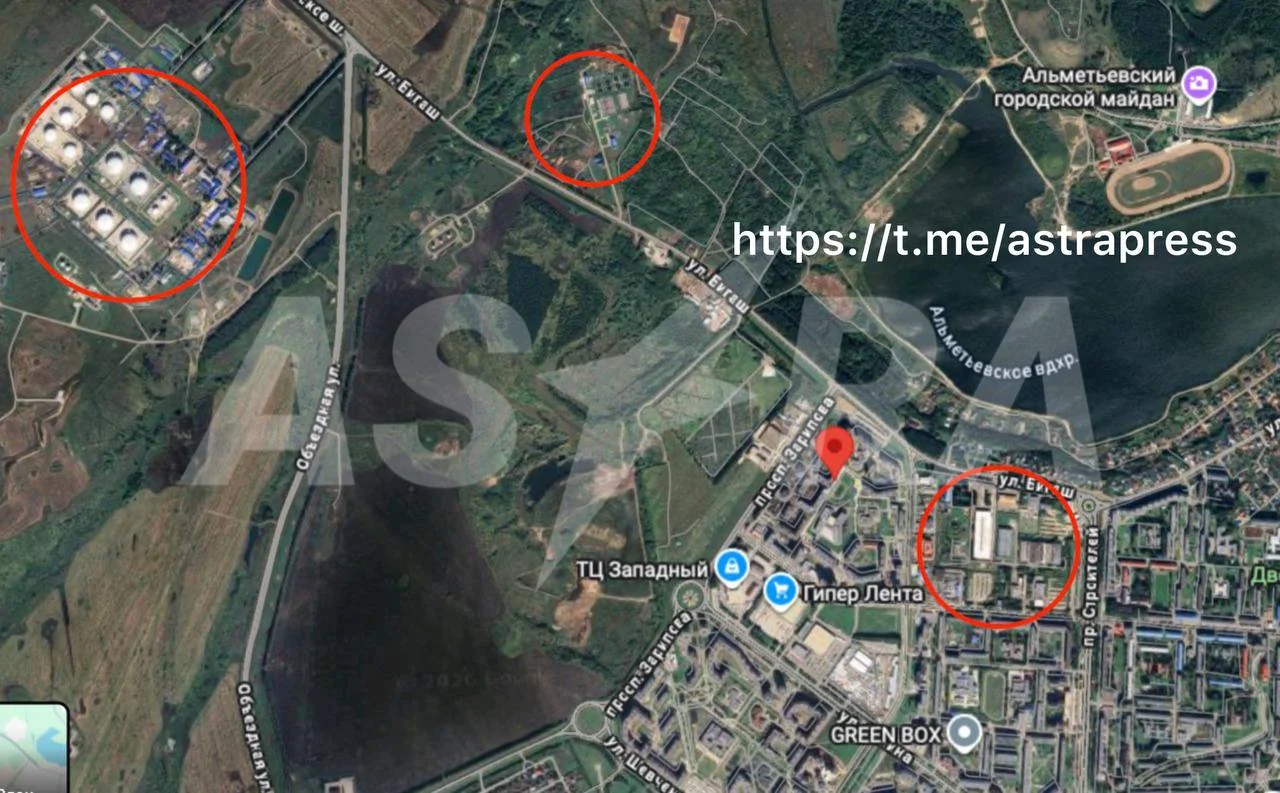 Telegram-канал Astra пише про проліт дронів в районі проспекту Заріпова в Альметьєвську, де розташовуються цистерни з паливом.