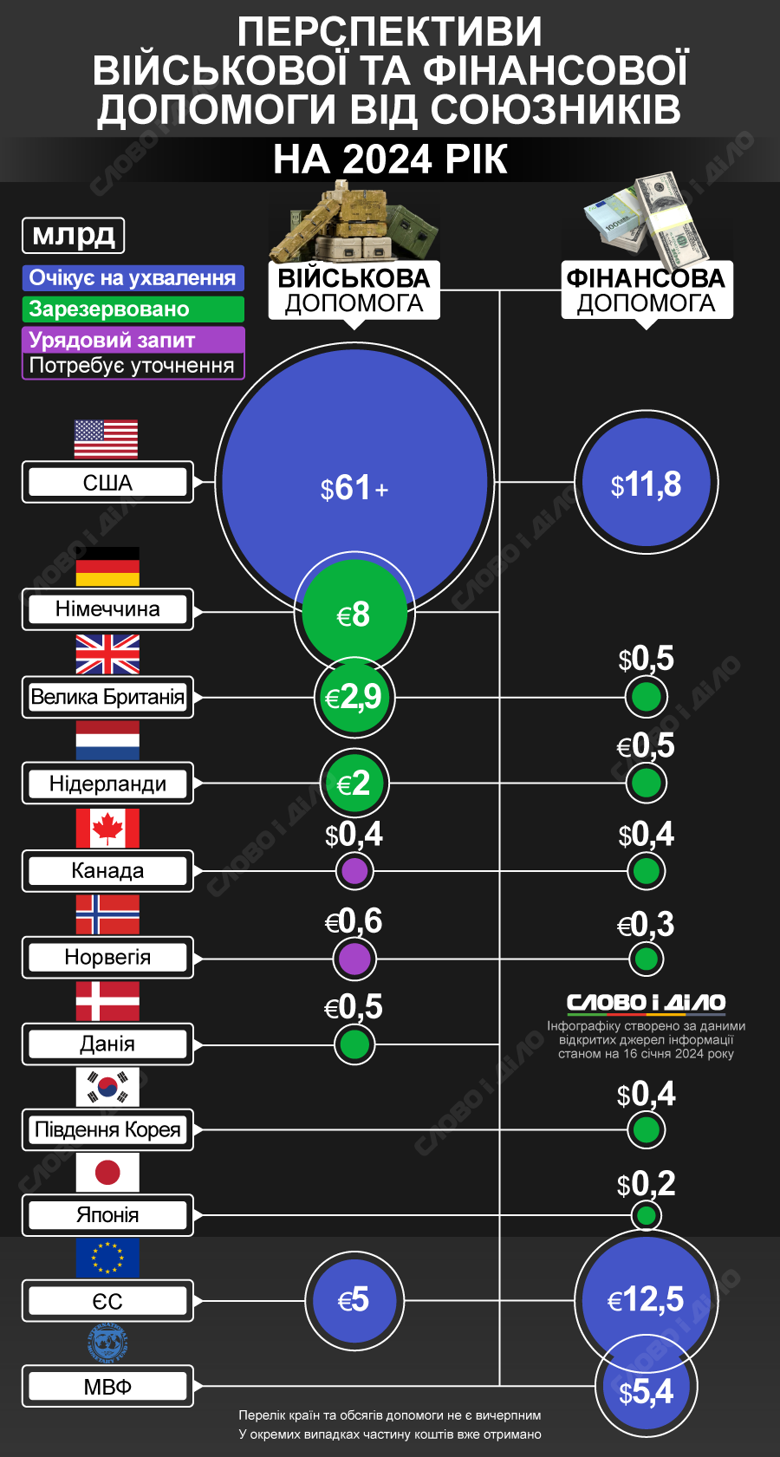 Україна увійшла у 2024 рік без стовідсоткової впевненості у фінансовій та військовій підтримці основних союзників – Євросоюзу та США. Під час виступу в Давосі президент Володимир Зеленський сказав, що отримав «позитивні сигнали» щодо допомоги від ЄС, а також сподівається, що американський Конгрес найближчим часом розблокує фінансування. На думку Зеленського, це питання «тижнів». Без зовнішнього фінансування Україна не зможе забезпечити всі витрати держбюджету, наслідки відсутності військової підтримки зрозумілі – перебіг війни може обернутися не на нашу користь. «Слово і діло» систематизувало дані про допомогу партнерів на цей рік.