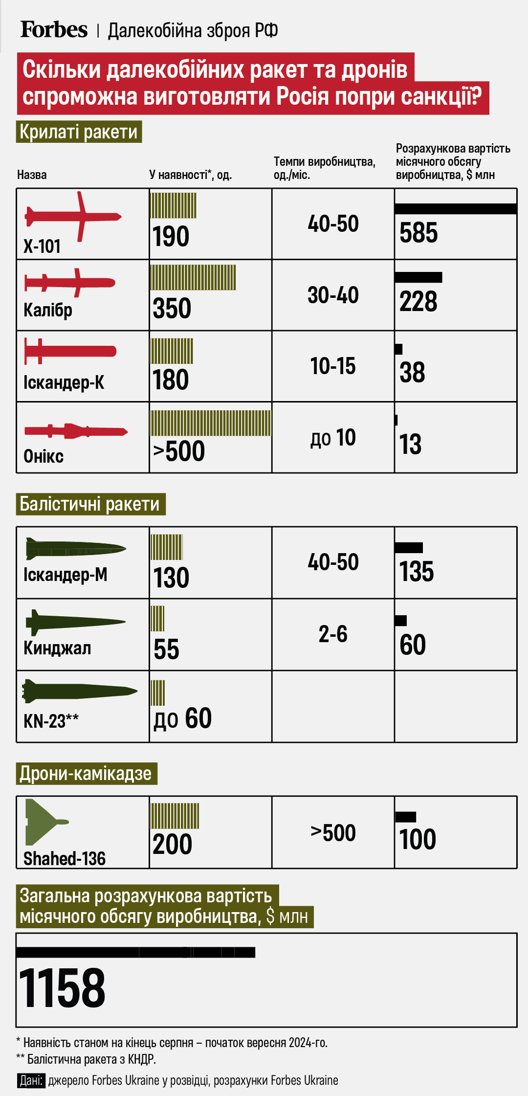 Сумарний темп виробництва у РФ становить 132–171 ракета на місяць, каже співрозмовник у розвідці. Виробництво ракет вартує РФ $1,1 млрд, дронів – близько $100 млн, за оцінкою Forbes Ukraine. Для порівняння: приблизно таку саму кількість ракет ворог запустив під час рекордного обстрілу 26 серпня, вартість якого Forbes Ukraine оцінив у $1,2–1,3 млрд.